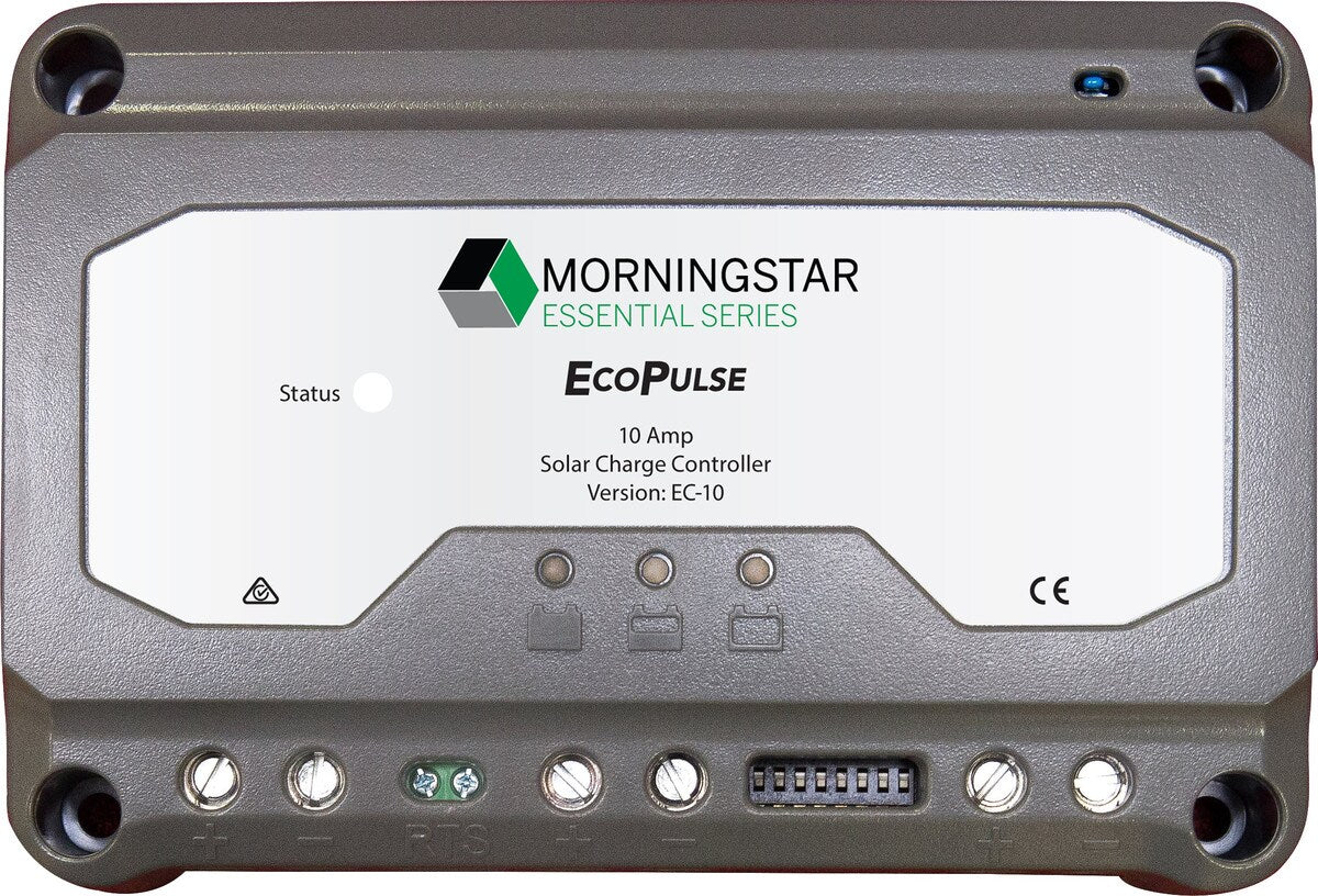 The Morningstar EC-10 EcoPulse is a 10A PWM Solar Regulator designed for 12/24V batteries. This regulator is part of the Morningstar Essential Series, providing essential off-grid battery regulation functions. It is user-friendly and ideal for residential and leisure consumer applications.