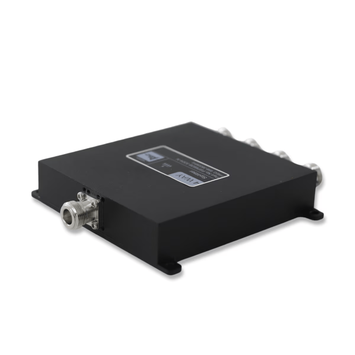 Pulse PSP6938-5304-N Wideband 4-Way Wilkinson Splitter/Combiner is a versatile device that evenly splits RF input signals into four output ports while maintaining high isolation between the output ports. It covers the frequency range of 698-3800 MHz and is equipped with N (F) connectors. This splitter/combiner is suitable for both dividing and combining signals, offering flexibility in communication and RF systems. All ports need to be connected to 50 Ohms. Any unused ports should terminate with a dummy resistive coaxial load or cable load.