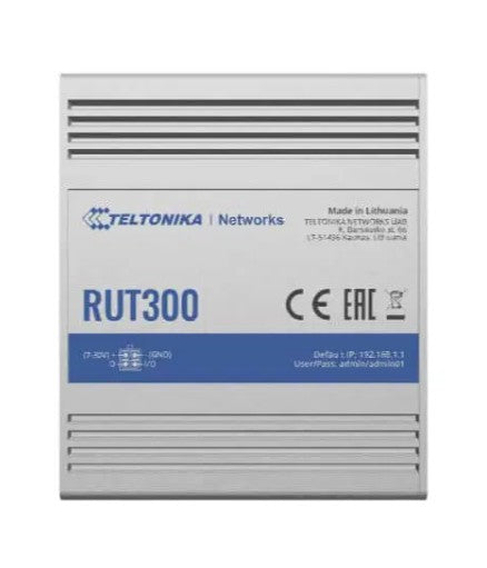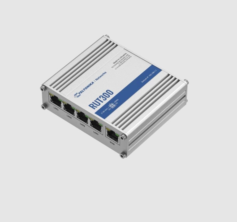 The Teltonika RUT300 is a robust and compact industrial Ethernet router designed to handle challenging networking tasks in various environments. It includes 1 WAN and 4 LAN ports, providing versatile connectivity options for different devices. The router features two configurable digital I/Os, allowing for flexible integration and control of connected equipment.