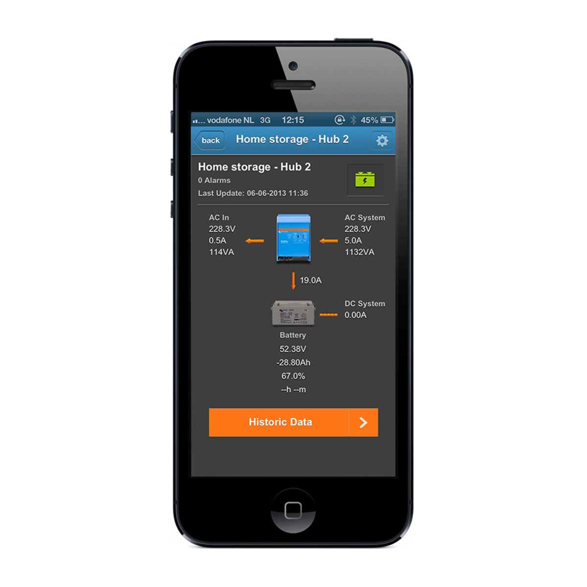 - It provides an intuitive system overview, giving instant, at-a-glance details about your system, including battery state of charge, current power consumption, PV power harvest, and mains/generator power provision.